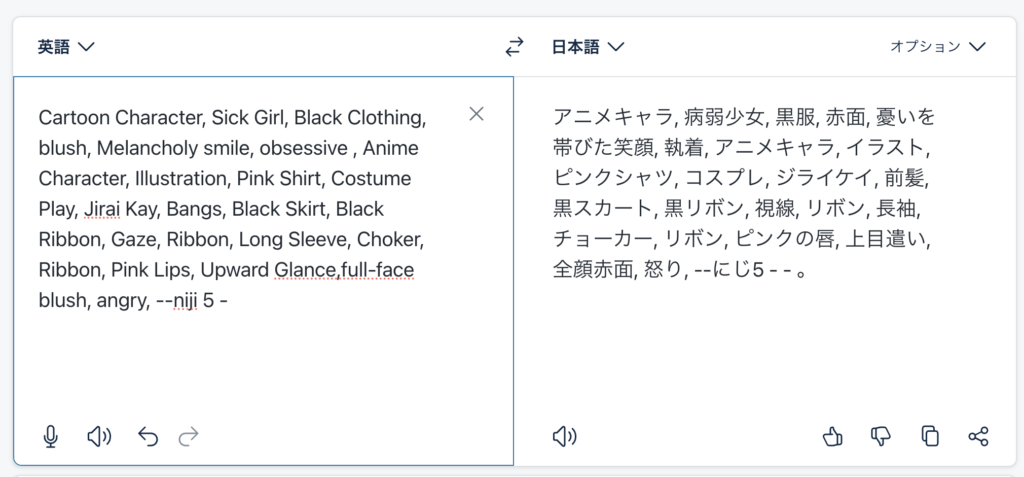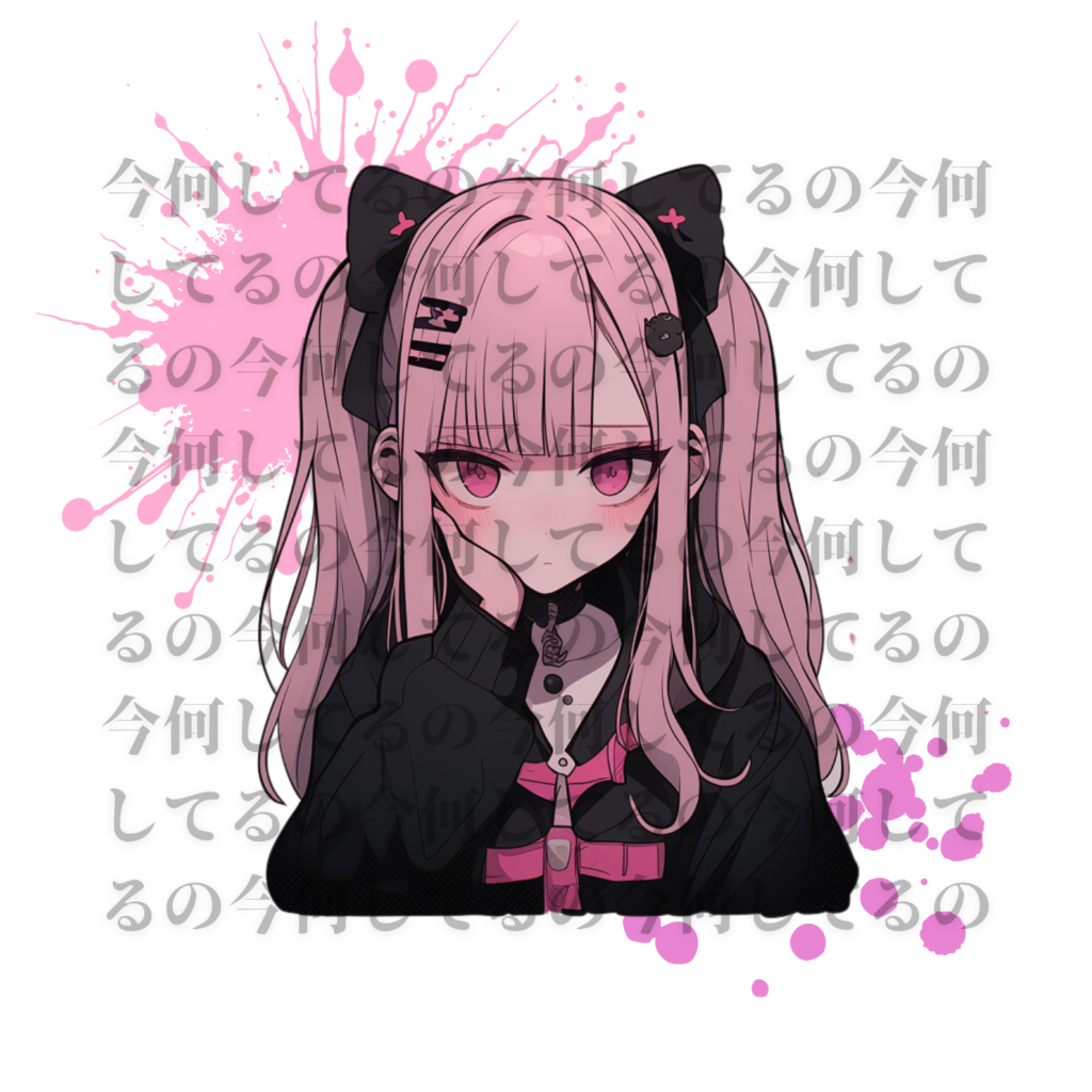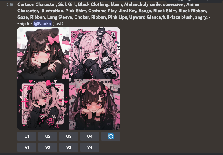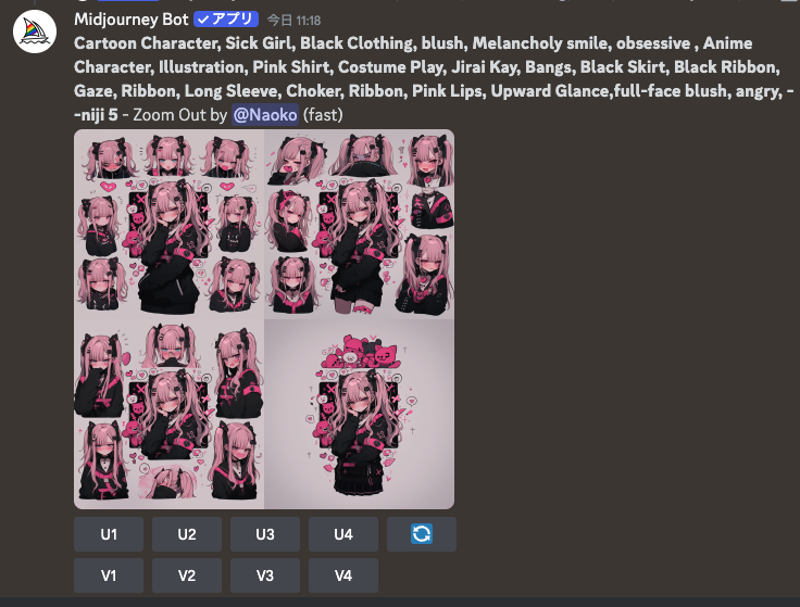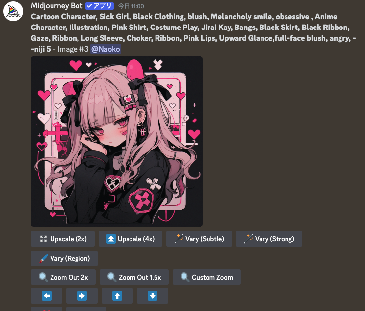 次のようなプロンプトを入力し、まずは地雷系の少女のイラストを生成します。アニメキャラクターを作りたい時は最後に 「– niji 5」とつけるとアニメキャラになってくれます。