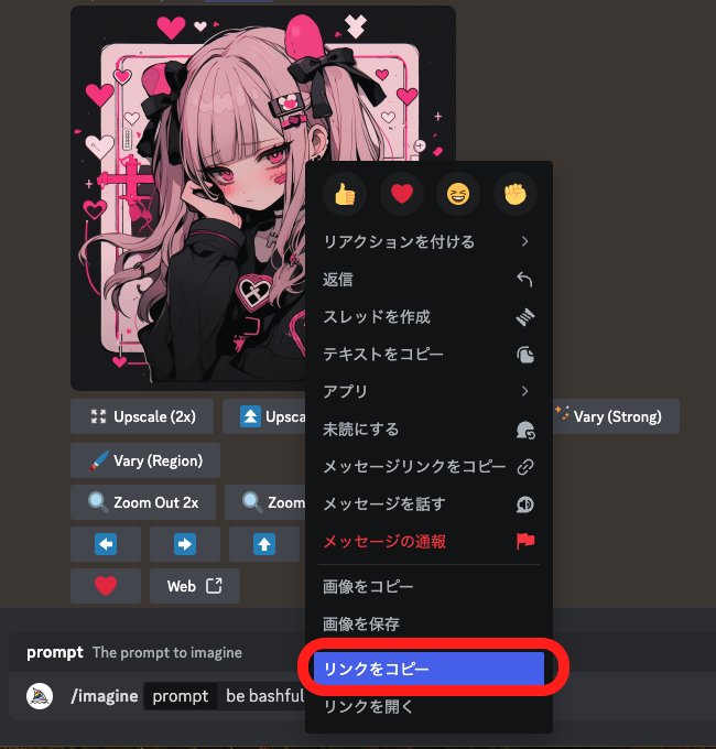 同じキャラクターでレパートリーを作りたい場合はstableディフュージョンのLoRAというツールや、Midjourneyで専用のプロンプトを使うことで同じキャラクターでのレパートリーを増やすことができます。以下に地雷系の女の子のキャラクターを生成し、同じレパートリーでいくつか生成してみましょう。今回はMidjourneyを使います。