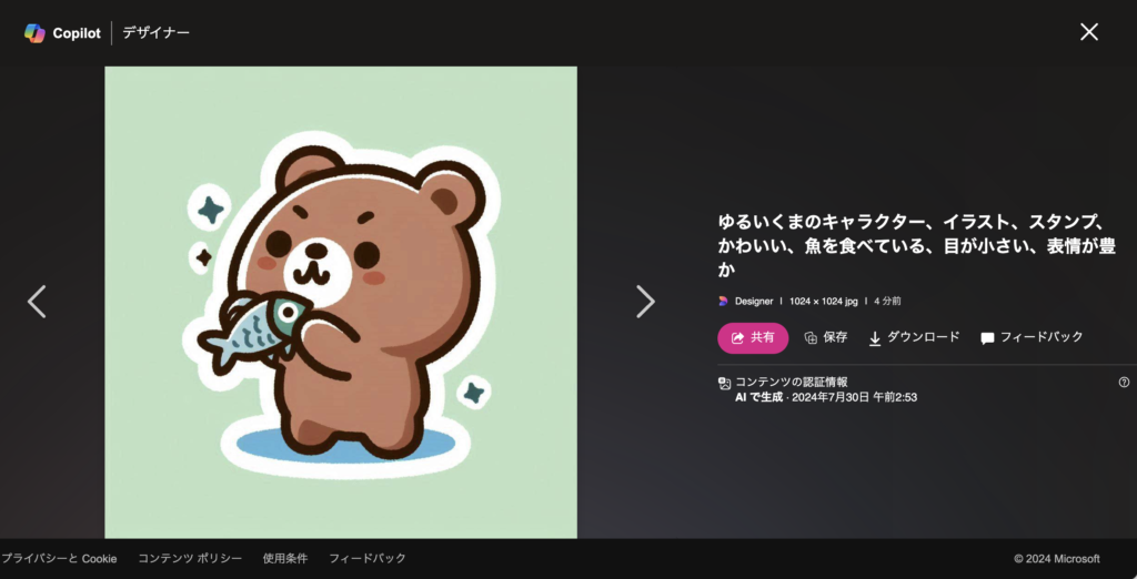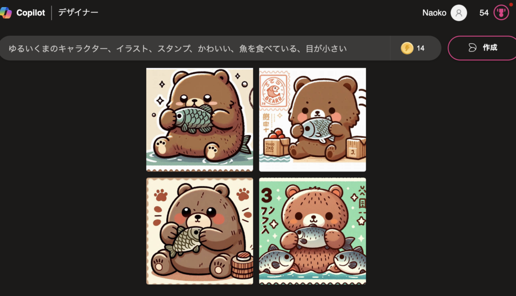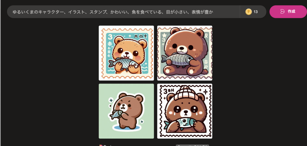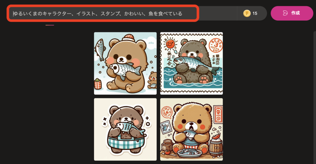 今回は例として魚を食べているかわいいクマを作ってみたいと思います。以下のようにプロンプトを送り、作成をクリックすると、画像が生成されます。