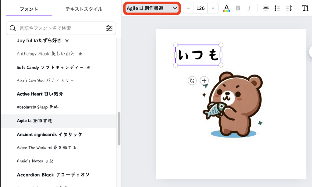 次にフォントを変更します。テキストを選択し、画面上部のフォント名の部分をクリックするとフォントが選べるようになるので、好みのフォントを選択します。今回はAglie Li 創作書道を使いましたが、お好みのものでOKです。