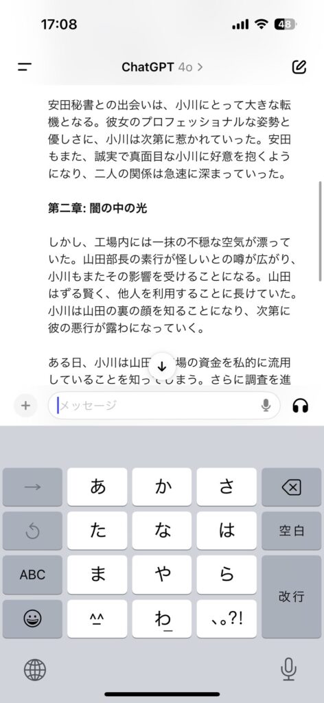 ある程度内容が固まり、納得のいく物語の導線ができたら、ChatGPTから生成された物語をもとに、自身の感性や言葉を用いて色付けを行っていきましょう。